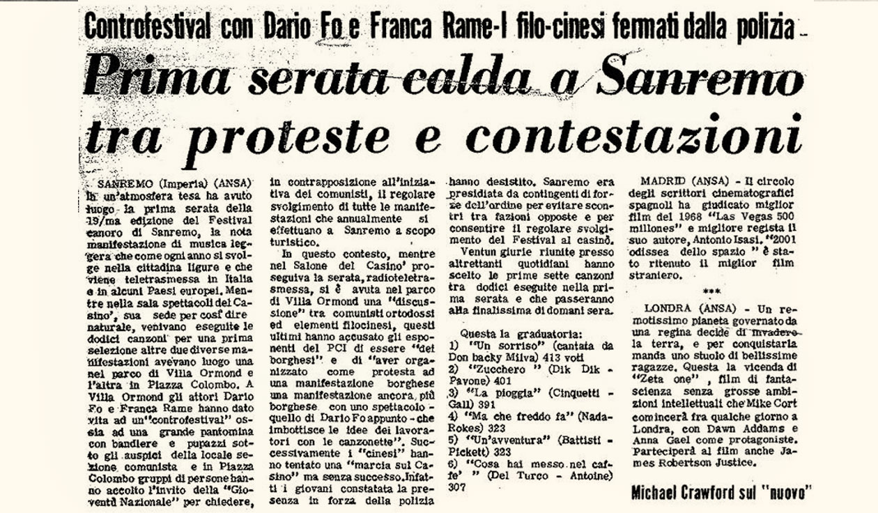 Dario Fo e Franca Rame annunciano un “Controfestival” per contestare una manifestazione “prodotto della borghesia che addormenta le coscienze dei lavoratori”. La contestazione dapprima allarma gli organizzatori, poi tutto si svolge regolarmente. Pochi giorni prima del Festival Anna Identici tenta il suicidio e viene sostituita da Rosanna Fratello. Partecipa anche Mary Hopkin, una cantante prodotta da Paul Mc Cartney e sotto contratto con i Beatles da pochi mesi. Da segnalare ancora il debutto di Stevie Wonder che arriva penultimo abbinato a Gabriella Ferri. Vincono Bobby Solo e Iva Zanicchi con “Zingara”.
