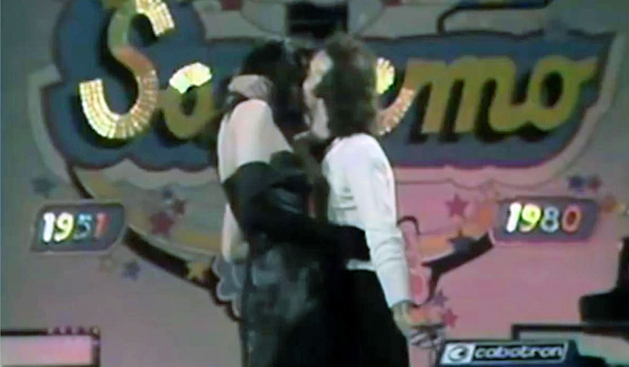 Sanremo viene presentato da un trio d’eccezione: Roberto Benigni, Claudio Cecchetto e Olimpia Carlisi. Lo scatenato Benigni, dopo aver rassicurato il patron Ravera sul fatto che non ci sarebbero state sorprese, prima sbeffeggia il Papa e altri personaggi politici, poi durante il collegamento in Eurovisione si esibisce con la collega Olimpia Carlisi in un bacio della durata di 45 secondi. Tra lo stupore e il divertimento del pubblico, verranno portati via con la forza.