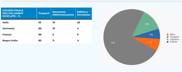 • In Italia l’alluminio riciclato è usato per trasporti (55 per cento), meccanica (19 per cento), edilizia e domestico (26 per cento).