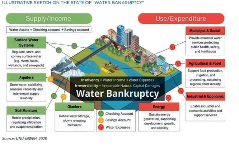 Altro che aumento dei pezzi del gas e del petrolio, altro che possibile crisi economica: piuttosto, il mondo è vicino alla bancarotta idrica. Motivo per cui la Giornata mondiale dell’acqua, che si celebra il 22 marzo, deve essere un’occasione vera di riflessione e confronto. A parlare di bancarotta idrica è il Blue Book 2026, il rapporto annuale sul servizio idrico integrato in Italia realizzato da Utilitalia e Fondazione Utilitatis, che cita dati, allarme e definizione della University of United Nations: significa che il pianeta ha superato il punto in cui la domanda di acqua può essere soddisfatta dalle disponibilità rinnovabili. Non si tratta più di una crisi temporanea da cui uscire quando si vuole: le dinamiche già in corso (svuotamento delle falde acquifere, ritiro dei ghiacciai, alterazione del ciclo idrologico) sono in larga parte irreversibili sulla scala temporale umana. E qui entra in gioco l’Italia, visto che il Mediterraneo è tra le aree del pianeta tra le più esposta agli effetti della crisi climatica.