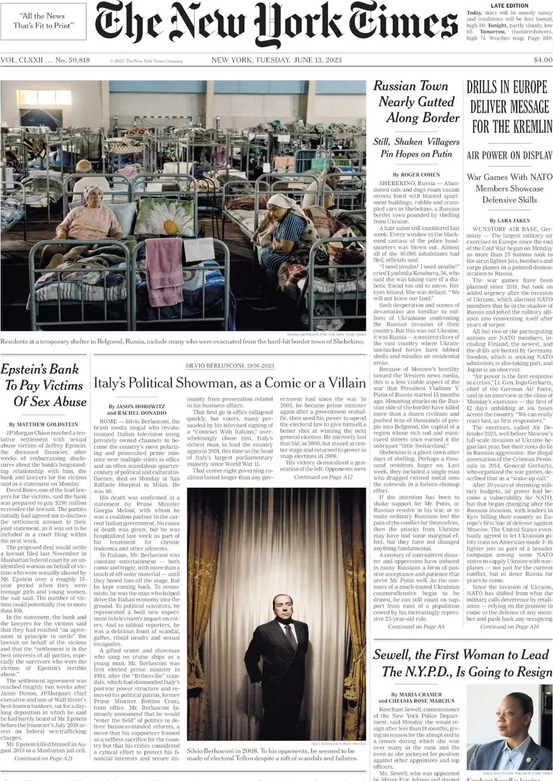 L’importanza della figura di Berlusconi è riconosciuta anche negli Stati Uniti: il New York Times lo ricorda come “showman, che ha introdotto il sesso e il glamour nella Tv italiana e poi ha portato la stessa formula in politica, dominando il Paese e la sua cultura per più di 20 anni”. Ma il titolo “as a comic or villain”, furfante, rimanda agli scandali giudiziari.