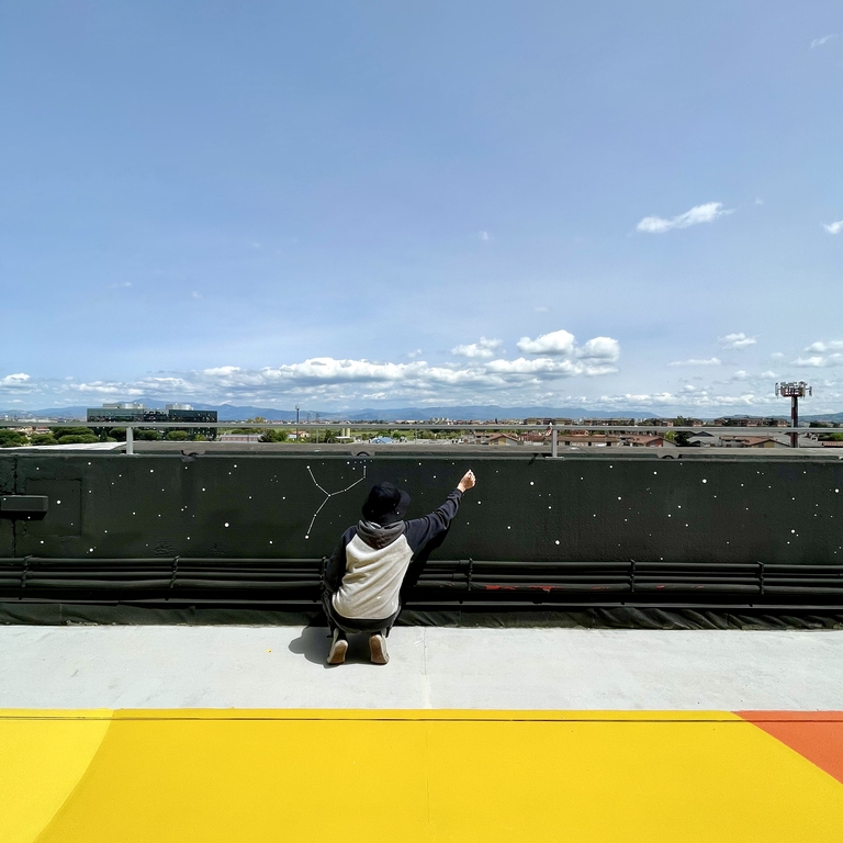 Uno, che vive proprio in questo quadrante di Roma, si è occupato della grande pista perimetrale panoramica lungo la quale, oltre ai punti cardinali, ha scelto di disegnare un cielo stellato. “Appena sono salito su questa terrazza – racconta – mi ha colpito questa sensazione di vicinanza tra il cielo e la terra. Mantenere il senso di un’opera unica su una superficie così ampia non è stato facile, e per questo motivo ho deciso di chiamarla 361: 360 come la vista a 360 gradi che si gode da qui, con l’aggiunta del mio nome d’arte”.