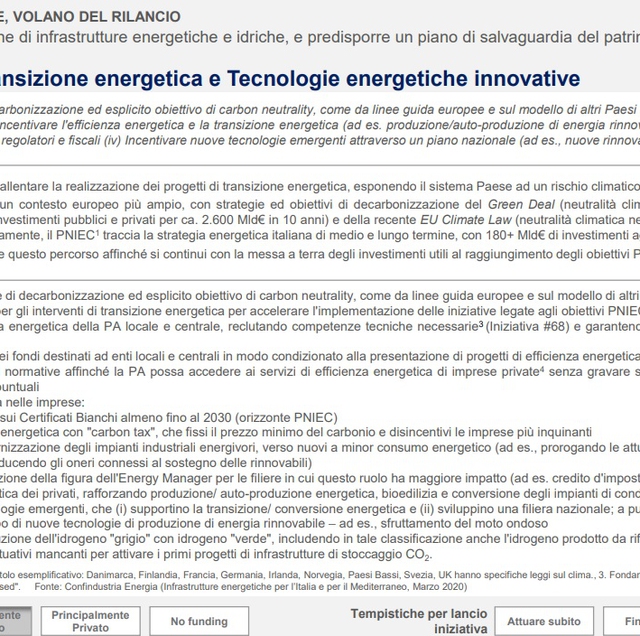 Proprio alla transizione energetica è dedicato un intero paragrafo: in un contesto in cui la pandemia da Covid-19 rischia di rallentare la realizzazione dei progetti di transizione energetica, esponendo il sistema paese ad un rischio climatico e anche a perdita di competitività sui mercati, è necessario “definire un piano a lungo termine di decarbonizzazione e un esplicito obiettivo di carbon neutrality, come da linee guida europee e sul modello di altri paesi; incentivare l’efficienza energetica e la transizione energetica (ad esempio la produzione e l’auto-produzione di energia rinnovabile) di imprese, pubbliche amministrazioni e privati”.