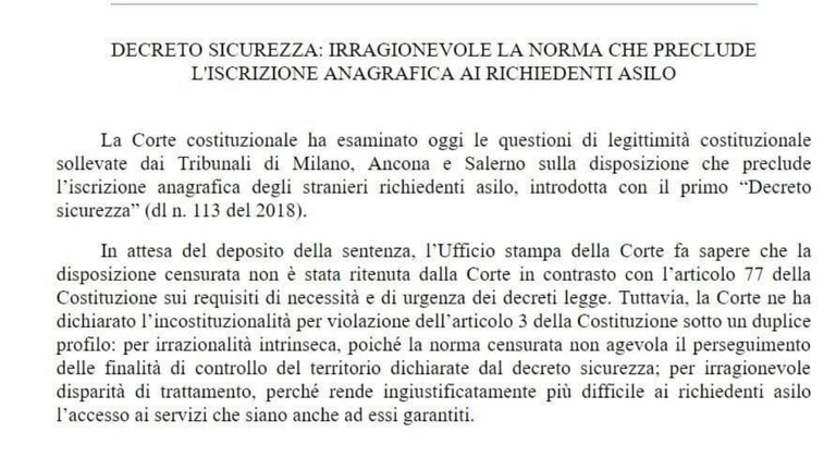 A stabilirlo è una sentenza della consulta, la Corte costituzionale, che ha dichiarato incostituzionale questo passaggio del decreto sicurezza, voluto dall’allora ministro dell’Interno Matteo Salvini, perché contrario all’articolo 3 della Costituzione, che recita che “tutti i cittadini hanno pari dignità sociale e sono eguali davanti alla legge, senza distinzione di sesso, di razza, di lingua, di religione, di opinioni politiche, di condizioni personali e sociali”.