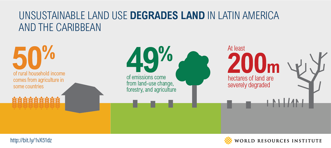 Attualmente oltre il 68 per cento del suolo in Sud America è minacciato dall’erosione, cento milioni di ettari di terreno sono stati danneggiati dalla deforestazione, mentre settanta milioni di ettari sono stati sfruttati eccessivamente. La desertificazione, ad esempio, affligge il 55 per cento della regione nord-orientale del Brasile ed ha serie ripercussioni sulle principali colture alimentari ad uso umano, come mais e fagioli. In Argentina, Messico e Paraguay, oltre la metà del territorio soffre problemi legati al degrado del suolo e alla desertificazione. In Bolivia, Cile, Ecuador e Perù tra il 27 e il 43 per cento del territorio deve resistere alla desertificazione. Particolarmente grave è la situazione della Bolivia, dove sei milioni di persone, il 77 per cento della popolazione, vivono in aree degradate.