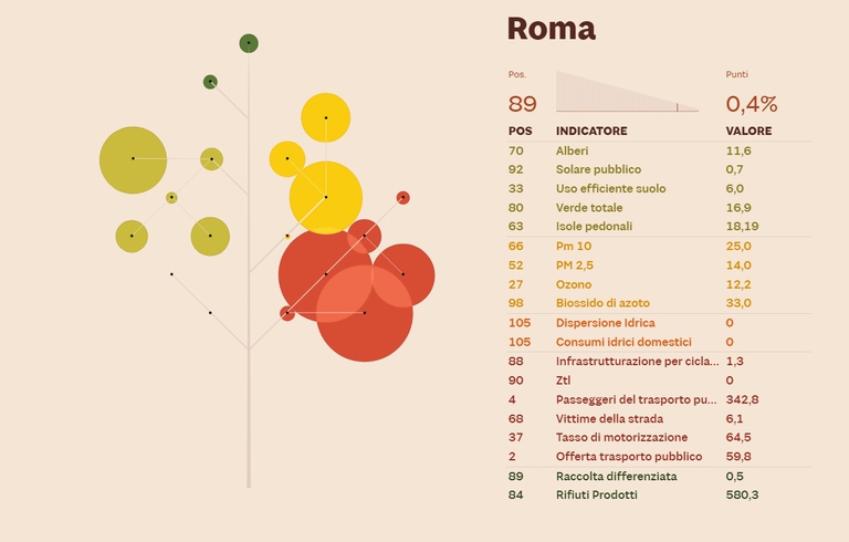 E poi anche il suolo, consumato e degradato in città come Venezia, dove il 100 per cento del territorio comunale è urbanizzato; l’energia, che è poco efficiente e poco rinnovabile in città come Napoli, Palermo, Torino o Roma, dove il solare termico e fotovoltaico ha una bassa diffusione (0,02 per cento della superficie comunale a Napoli). Fino alla mobilità dolce, che è scarsamente praticata e incentivata in città come Napoli, Genova o Roma, dove le piste ciclabili sono quasi inesistenti (0,1, 0,2 e 0,3 per cento della rete stradale rispettivamente).