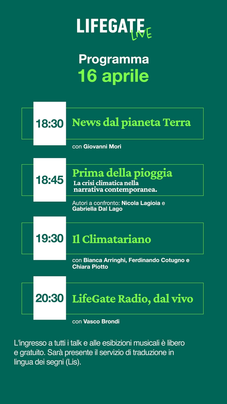 Alle 19:30 sarà la volta de Il Climatariano, la newsletter del direttore di LifeGate, Tommaso Perrone. Per l’occasione, il format si apre al pubblico con il talk dal titolo Il pianeta cambia, l’informazione pure. In un mondo in cui la sostenibilità conquista sempre più spazio nei media, come possiamo informarci in modo consapevole e duraturo? Risponderanno tre voci autorevoli del giornalismo italiano: Bianca Arrighini (Factanza), Ferdinando Cotugno (Domani) e Chiara Piotto (Sky TG24).