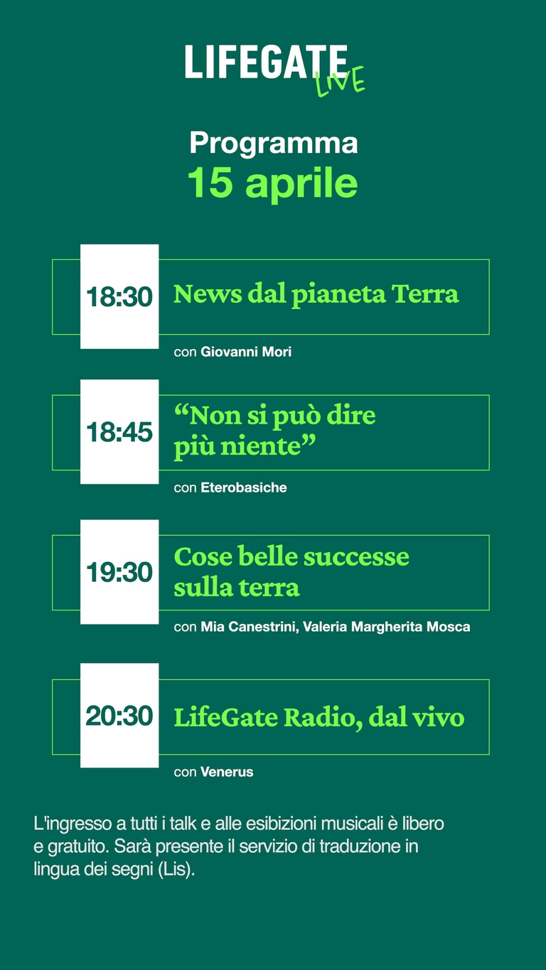 La rassegna si apre lunedì 15 aprile alle 18:30 con un appuntamento speciale di News dal pianeta Terra, il daily podcast di LifeGate condotto da Giovanni Mori. Per l’occasione, Mori sarà in conversazione con le Eterobasiche, la coppia social formata da Valeria De Angelis e Maria Chiara Cicolani, per affrontare un tema molto attuale: si può davvero dire tutto, se si sa come dirlo? Un dialogo vivace che smonta il mito del “non si può più dire niente” e affronta con ironia e consapevolezza il tema degli stereotipi di genere.