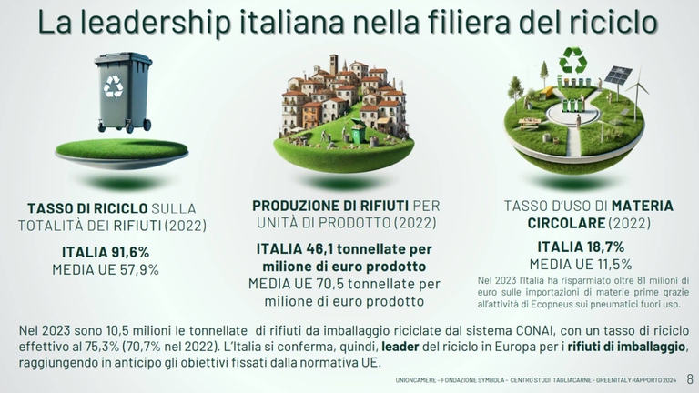 - E l’Italia è sempre più leader europeo nel riciclo, con il 91,6 per cento nella gestione dei rifiuti.