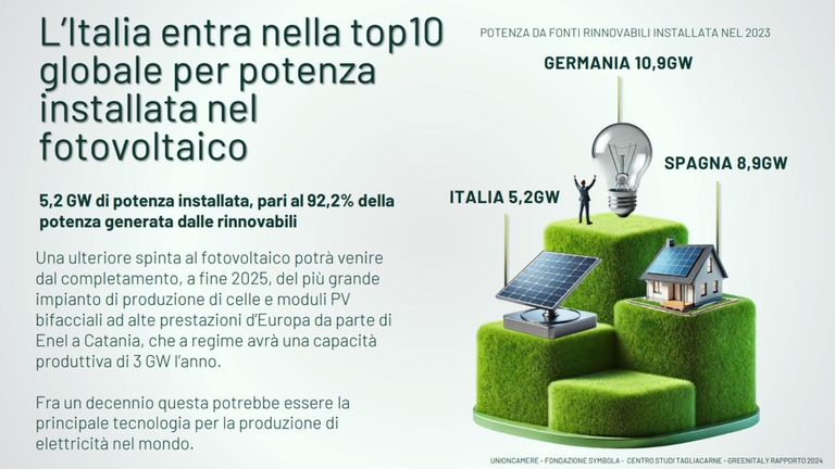 Dalla chimica bio-based all’automotive, pur con tutti i problemi, i settori economici tradizionali stanno vivendo una profonda trasformazione, grazie a una forte spinta verso le tecnologie Net Zero, come il fotovoltaico e l’eolico. Nel 2023, l’Italia ha installato ben 5,2 GW di energia rinnovabile, entrando a piedi pari nella top ten dei Paesi al mondo per potenza fotovoltaica installata e confermandosi tra i leader europei nell’adozione di tecnologie avanzate per la decarbonizzazione.