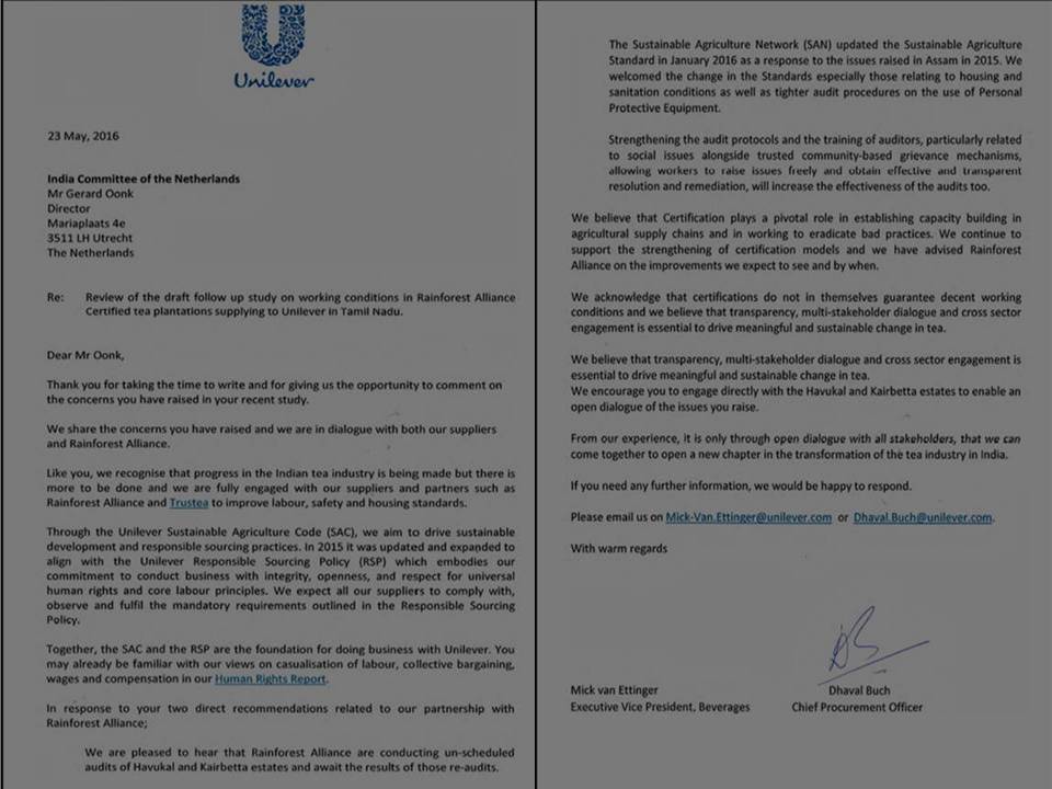 Il fornitore indiano Glocal Research e l’organizzazione per i diritti umani India committee of the Netherlands hanno svolto un approfondimento del rapporto Certified Unilever Tea – Small Cup, Big Difference? del 2011. L’organizzazione ha indagato le condizioni di lavoro in otto grandi piantagioni certificate Rainforest alliance che riforniscono Unilever, evidenziando in tutte queste numerose inadempienze sistematiche degli standard.