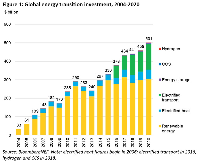Secondo Bnef superati i 500 miliardi di dollari nel 2020, con un aumento del 9 per cento rispetto all’anno precedente. Merito dei grandi impianti solari, dell’eolico offshore e della mobilità elettrica.