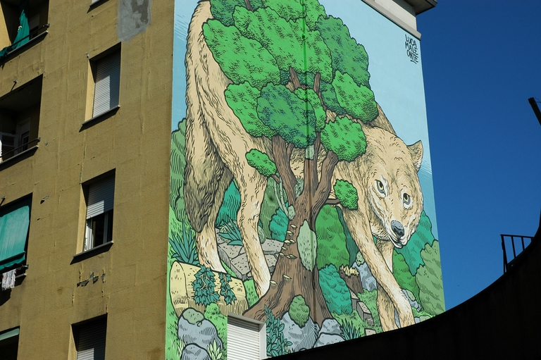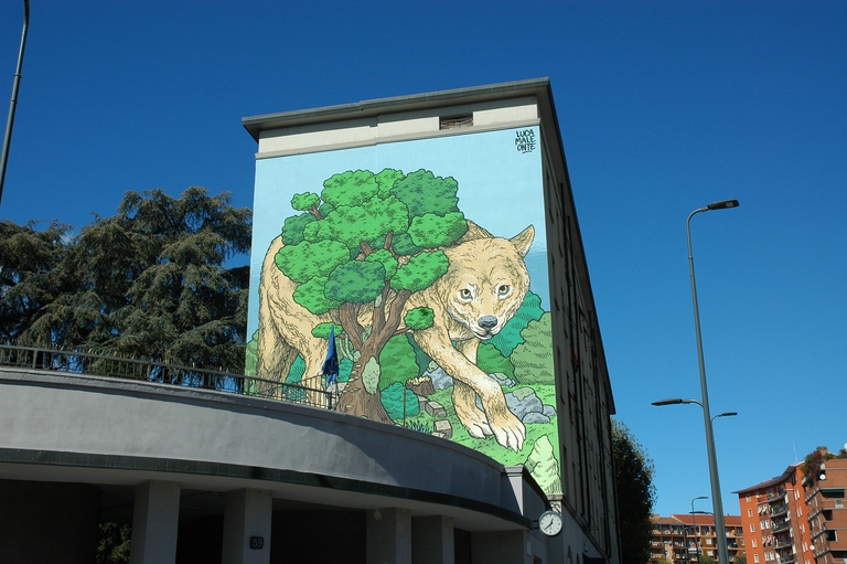È comparso un lupo sulla facciata di una casa di edilizia popolare in via Palmanova 59, a Milano. È un murale gigante, di 150 metri quadrati, che l’artista Lucamaleonte ha realizzato sul muro cieco di un edificio, che nel 2018 è stato teatro di uno spiacevole episodio di sgombero di dodici appartamenti, su due piani, occupati abusivamente. Il proprietario dello stabile è il Comune di Milano che ha concesso l’opera sotto la direzione del collettivo Orticanoodles, già esperto di arte urbana, e con il sostegno della Fondazione Arrigo e Pia Pini.