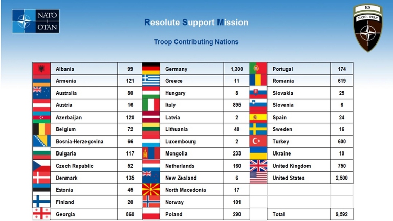 La missione Resolute support della Nato mira all’addestramento delle forze di sicurezza afgane e al rafforzamento delle istituzioni locali, e vede attualmente sul campo 9.592 uomini provenienti da 36 diversi Paesi: l’Italia contribuisce con 850 unità sul campo, un numero inferiore solamente a quello degli Stati Uniti (2.500) e della Germania (1.300). Anche il Regno Unito ha annunciato il ritiro dei propri 750 soldati in Afghanistan entro l’11 settembre, e conferme sono arrivate anche dall’Australia, che del resto aveva già iniziato il proprio disimpegno passando dai 1.500 uomini sul campo due anni agli attuali 80.