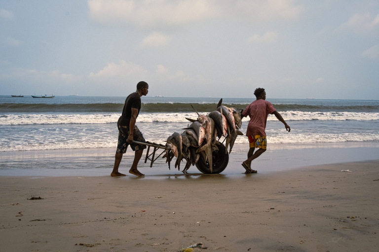 Sulla spiaggia di Songolo la marea è bassa ed è l’ora dello scarico del pesce per alcune delle piroghe che attendevano in rada dopo una settimana trascorsa in mare aperto. Una grande “popo” viene accostata alla riva. L’equipaggio di dodici uomini è rientrato da una battuta di pesca allo squalo. Dal ventre della barca enormi squali di oltre 100 chili vengono fatti uscire e poi trascinati sulla riva, molti sono squali martello, squali volpe e squali seta. Tutte specie a rischio. Man mano i marinai più giovani iniziano a portare a riva cassette piene di squali di taglia più piccola, molti sono quasi neonati.