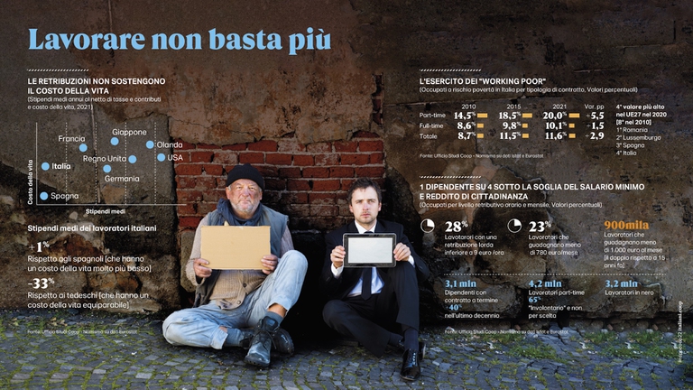 Quello che si era reso abbastanza evidente già nel 2021, nel 2022 è diventato manifesto: non basta avere un impiego per avere uno stile di vita dignitoso. I nostri salari sono gli stessi degli spagnoli, ma il costo della vita è del 20 per cento più alto, paragonabile a quello della Germania, dove però gli stipendi sono il 33 per cento più alti: un italiano su quattro è ampiamente al di sotto del salario minimo. Il 28 per cento degli impiegati guadagna meno di 9 euro lordi all’ora, non arrivano a 800 euro 23 italiani su 100 e sono 900mila le persone il cui reddito da lavoro dipendente non raggiunge i mille euro: il doppio rispetto a 15 anni fa. A questo dobbiamo aggiungere il fatto che 3,2 milioni di persone lavorano in nero, a 4,2 milioni è stato imposto un part-time e 3,1 hanno un contratto a termine. Se sommiamo a questo dato il fatto che l’inflazione oggi sfiora l’8 per cento, e non è detto che non cresca ancora verso la fine dell’anno, siamo di fronte all’emergere di una nuova classe di lavoratori: i “working poor”.