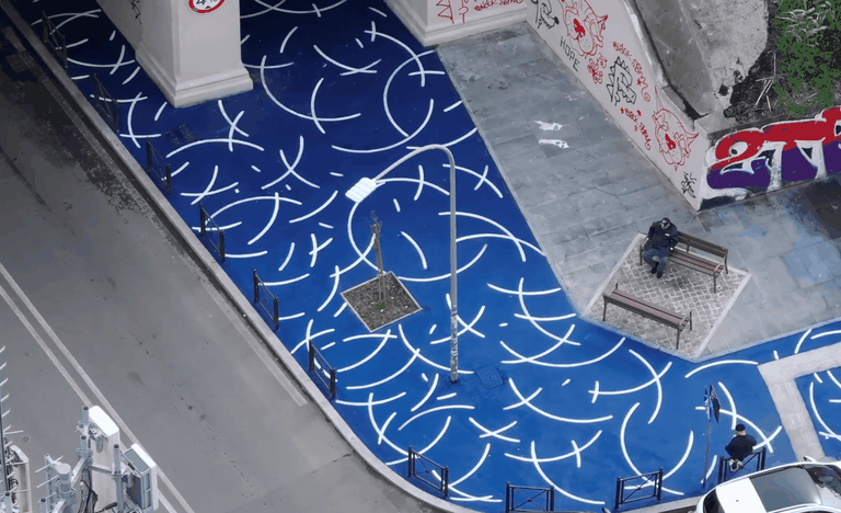 La centralità delle donne nella storia del quartiere è un filo rosso che attraversa tutte le opere di DOTS – Connecting Ostiense. E che conduce anche all’ultimo intervento di asphalt art calpestabile, quello realizzato da Alice Lotti lungo viale del Campo Boario e piazza Vittorio Bottego. Un’opera che si sviluppa lungo isole di traffico e marciapiedi, ritraendo i tanti luoghi e le principali epoche storiche che questa strada custodisce, dalla Repubblica romana fino alle donne della resistenza partigiana che qui hanno combattuto. Avvenimenti storici, paesaggio, architettura e persone sono le quattro aree alla base della narrazione, con simboli e figure che rielaborano la memoria di questo segmento di città, trasformandola in immaginario condiviso. Un quartiere che è da sempre luogo di scambio, passaggio e trasformazione da riscoprire attraverso un’opera pensata per essere calpestata, nella direzione di un’arte pubblica e partecipata.